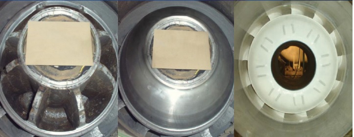 The work involved: fabricating replacement pump dome covers, rebuilding the guide vanes, grit blasting the pump bodies to standard Sa 2.5, then applying Corroglass 200 and finally a coating of Fluiglide.