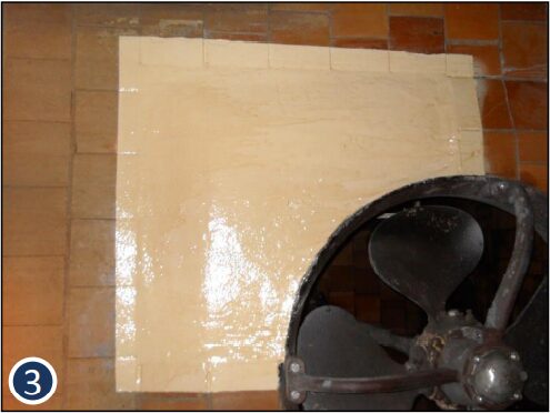 - Abrasive blast the concrete and onto the surrounding tile to allow the repair to tie into the adhered tile.