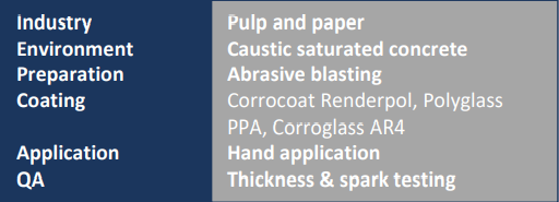 A tile lined concrete pit submerged at a pH of 14 required immediate repair and refurbishment. The repaired was required to be completed in the short term to prevent further damage and needed to be completed over a 36 hour shut down to limit downtime. Adhesion to the substrate was not possible due to the concrete being saturated with caustic, further complicating the repair process.