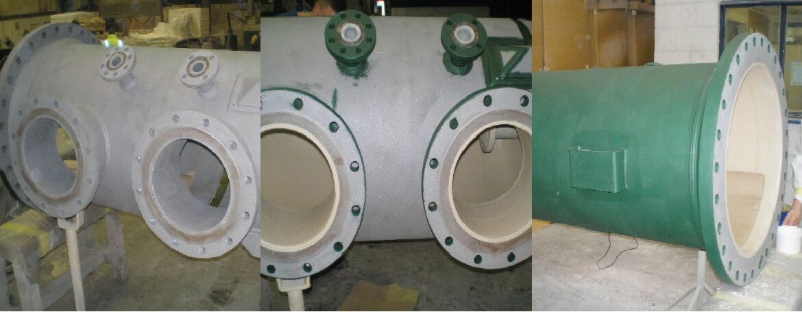 Internals of new vessel protected against sea water damage using Corroglass 600 Series and Polyglass VEF. Rebate flanges to protect against crevice corrosion. Terminate coating on steel rings.