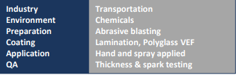 required dft of 200µm to complete the coating solution. Polyglass VEF is a ester/acrylic co-polymer loaded with glass flake and is ideal for use in areas were aggressive chemical conditions are experienced. It is also used in aggressive atmospheric or spillage conditions (bund areas) and potable water applications.