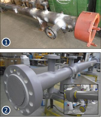 out multi-axial glass fabric to improve the integrity of the coating and avert cracking/de-lamination of the final coating. After suitable curing a second coat of Polyglass VEF was applied to a wft of 750µm, spark testing was completed to identify any pin holes/holidays.