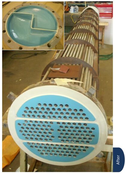The unit was abrasive blasted to Sa21⁄2 to provide a minimum surface profile of 50μm. Corroglass 600 series was then applied to the internals to achieve a minimum dft of 1500μm. During the blasting /coating procedure the ends of the condenser tubes were protected by inserting rubber plugs into the tube ends. This was done not only to protect the tube ends from the abrasive but also to ensure that no abrasive or debris could enter the tubes themselves.