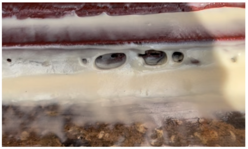 After filling about 80% of the holes, the pressure increased on the remaining cavities to the point that pinholes formed in the Corrofill E once placed. It took several passes and significant skill and patience to finally stop all of the air from escaping and fashion the filler to a shape that would allow for effective fiberglass application.