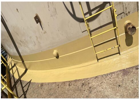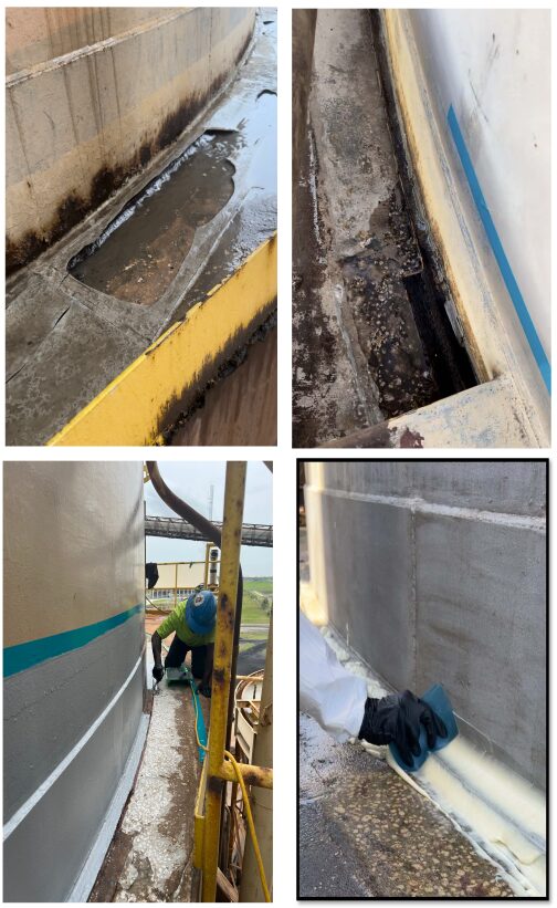 Each silo is 50 feet diameter. The repair included coating and sealing 16″ up onto the steel silo and 12 inches onto the concrete base.