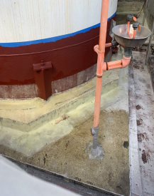including from the tank pedestal onto the tank walls