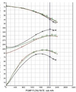 following results in comparison with the pump manufacturer’s test at design duty point (2100