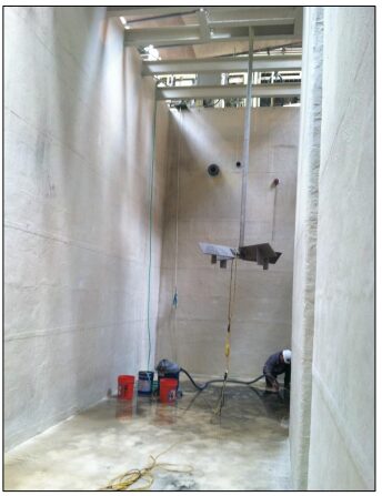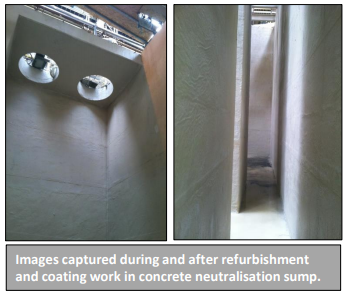 At a neutral pH and up to about 10, the concrete is inert to the presence of the water. However, when immersed in low pH, concrete will begin to react the water and gradually break down; particularly where dosing of the acid / caustic occurs. For this reason, the customer lined the concrete with a thin film epoxy material years prior to this re-line.