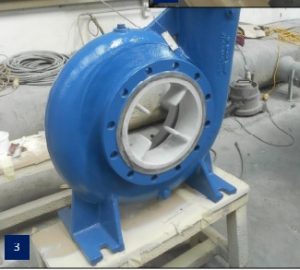 | 1: Pump on arrival. 2: Impeller during the coating process. 3: Completed pump casing reassembled after coating, before impeller re-fitted. |