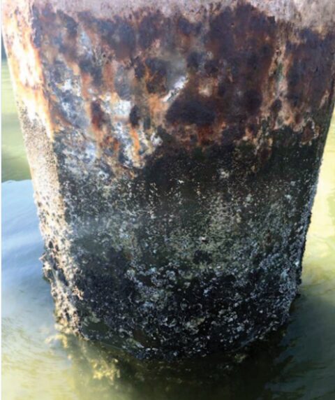 Corrocoat USA was asked to prepare and protect the 48” (1.2m) diameter pole to a height of 12ft (3.7m) and to complete this work in a tidal zone – quite a challenge! Zip E was selected due to its excellent barrier protection, great adhesion and fast drying time between coats of between 10 and 15 minutes. This was critical given the inevitable time deadlines imposed by an unstoppable tide.
